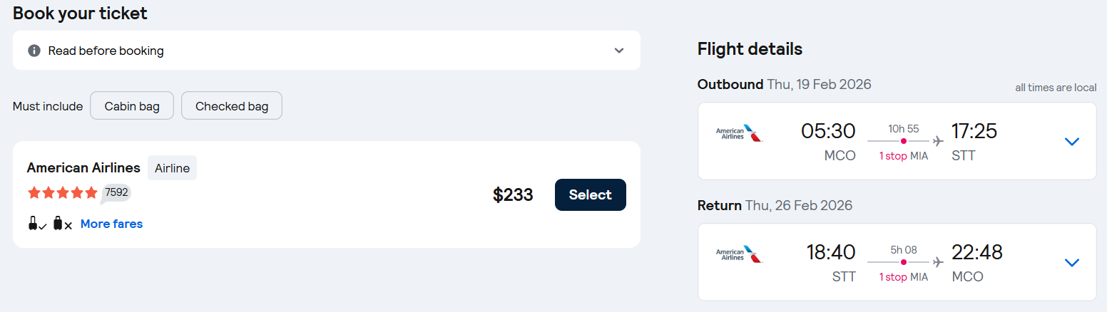 Fly one-stop flights from Orlando, Florida to the US Virgin Islands for only $233 roundtrip with American Airlines.