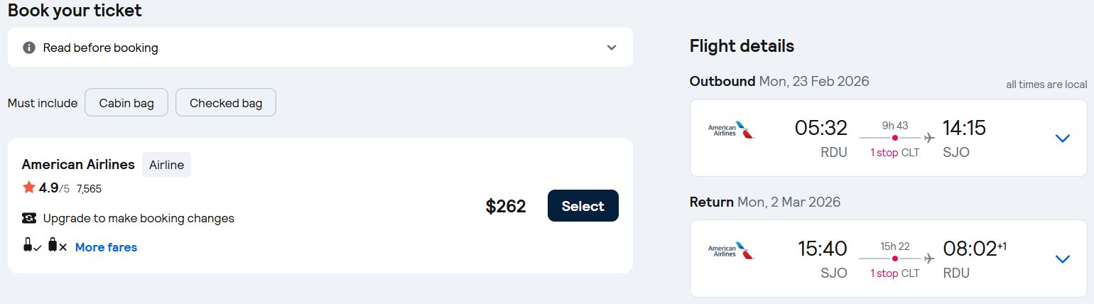 Fly one-stop flights from Raleigh, North Carolina to San Jose, Costa Rica for only $262 roundtrip with American Airlines.