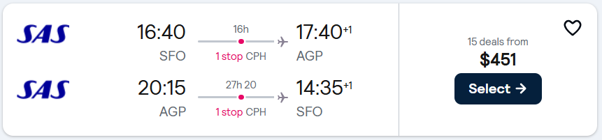 Fly one-stop flights from San Francisco to Malaga, Spain for only $451 roundtrip with Scandinavian Airlines.