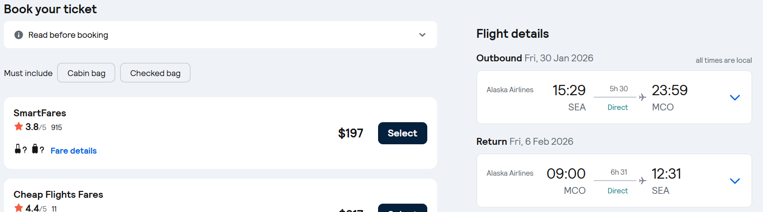 Fly Non-stop flights from Seattle to Orlando, Florida for only $197 roundtrip with Alaska Airlines.
