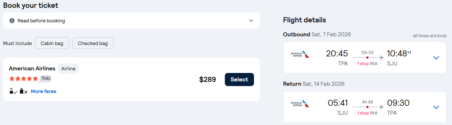 Fly one-stop flights from Tampa, Florida to San Juan, Puerto Rico for only $249 roundtrip with American Airlines.